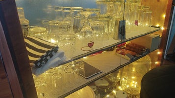 The bar has been replaced in 2023 with a single surface metal front version. Shelving with central cable support for glassware with lights all around.