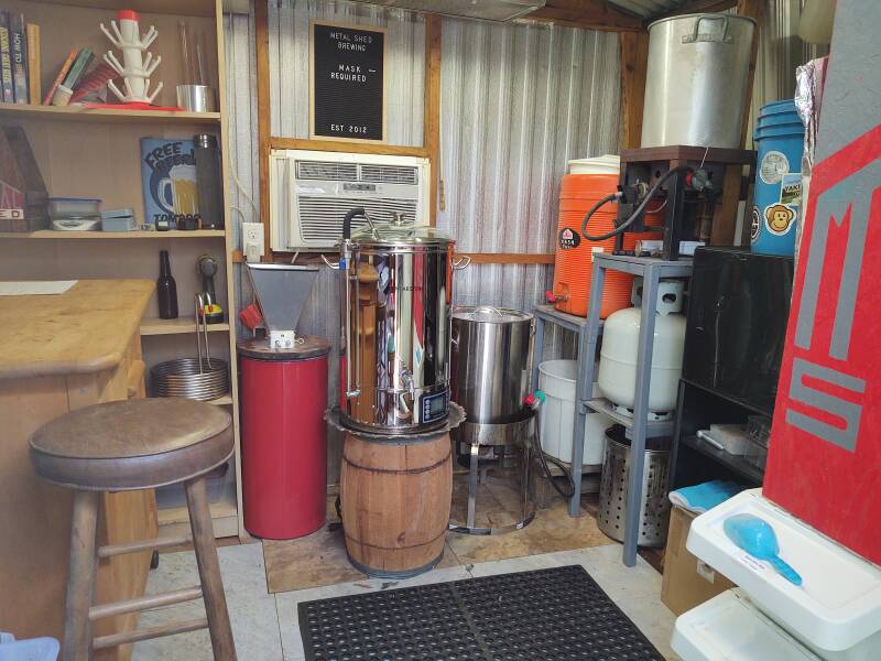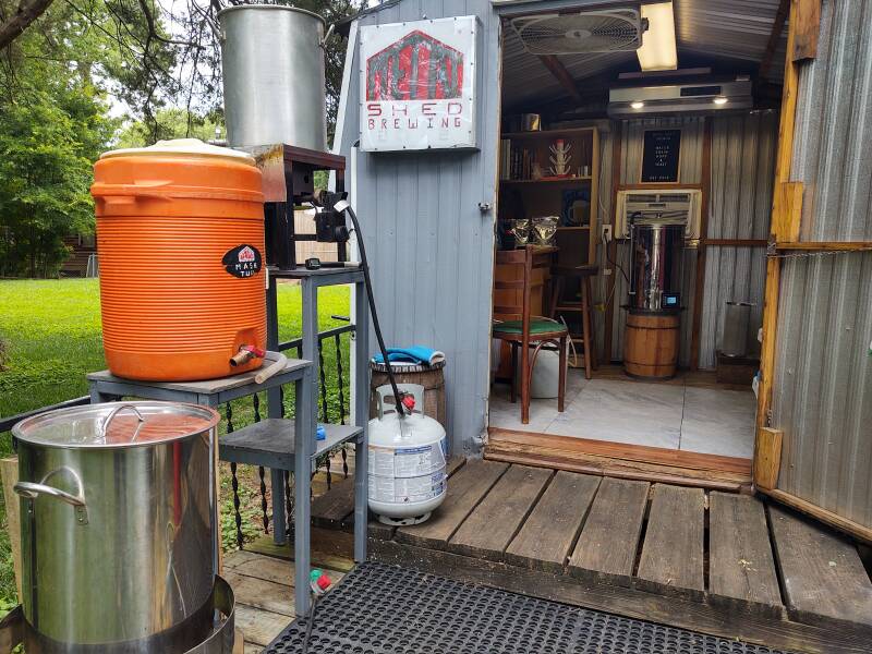 Two brews can be accomplished at the same time without overheating the shed by moving the propane system outside to the main deck and using the electric system inside. This works well by starting the electric system first followed by the propane system about 30 mins later. Both will begin the boil stage at about the same time. The fan over the door can be lowered to exhaust heat along with the hood from the shed when using the propane system inside. This is the best configuration when brewing two recipes on the two systems at the same time.